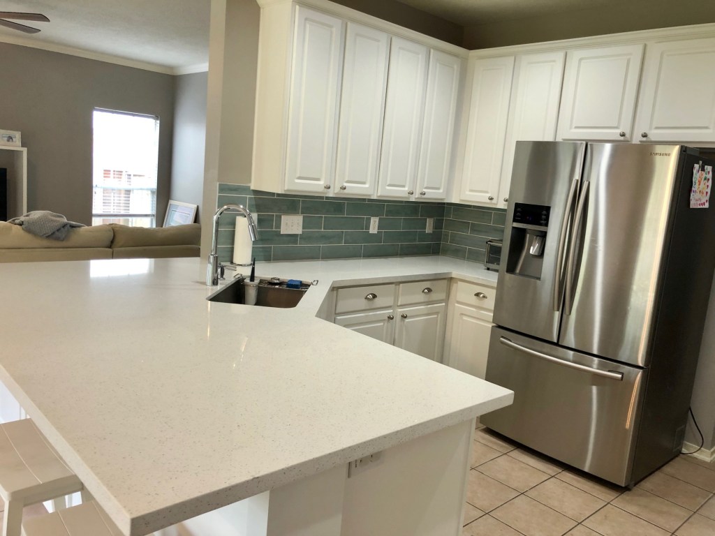 So I got to work and met with 3 local contractors to find out what our options would be to get rid of that two-tier recurring nightmare we have lived with for far too long. It turns out it’s a pretty easy (and popular) kitchen redesign project, although you do have to replace all your countertops which gets a little pricey. We made the final decision to go for it and replace our countertops (plus add more countertops and storage – you can never have too much of either in my opinion), the sink and faucet, and the backsplash to really give the kitchen a new look.